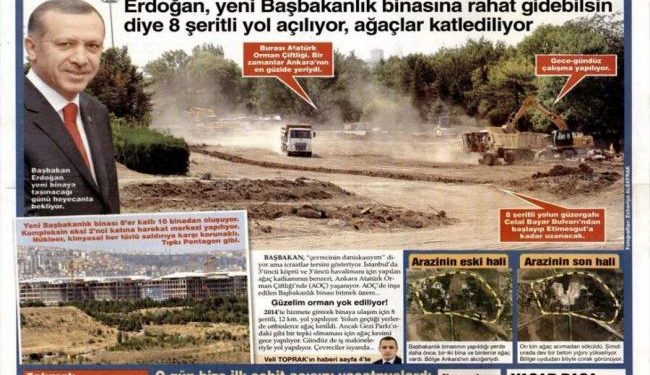 Η τουρκική εφημερίδα Sözcü με πρωτοσέλιδο δημοσίευμα και τίτλο « για το παλάτι του Ερντογάν , κόβουν τα δέντρα τη νύχτα και το πρωί κατασκευάζουν δρόμους» υποστηρίζει πως οι εργολάβοι που κατασκευάζουν το έργο , φοβούμενοι τις αντιδράσεις και τα επεισόδια που είχαν ξεσπάσει για τα δέντρα στο πάρκο Γκεζί, κόβουν τα δέντρα κατά τη διάρκεια της νύχτας ενώ την ημέρα πραγματοποιούν τις εργασίες για το δρόμο που οδηγεί στο συγκρότημα.