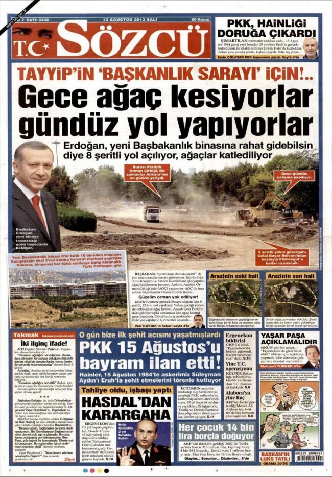 Η τουρκική εφημερίδα Sözcü με πρωτοσέλιδο δημοσίευμα και τίτλο « για το παλάτι του Ερντογάν , κόβουν τα δέντρα τη νύχτα και το πρωί κατασκευάζουν δρόμους» υποστηρίζει πως οι εργολάβοι που κατασκευάζουν το έργο , φοβούμενοι τις αντιδράσεις και τα επεισόδια που είχαν ξεσπάσει για τα δέντρα στο πάρκο Γκεζί, κόβουν τα δέντρα κατά τη διάρκεια της νύχτας ενώ την ημέρα πραγματοποιούν τις εργασίες για το δρόμο που οδηγεί στο συγκρότημα.