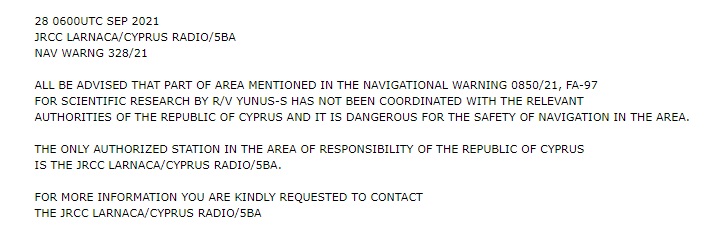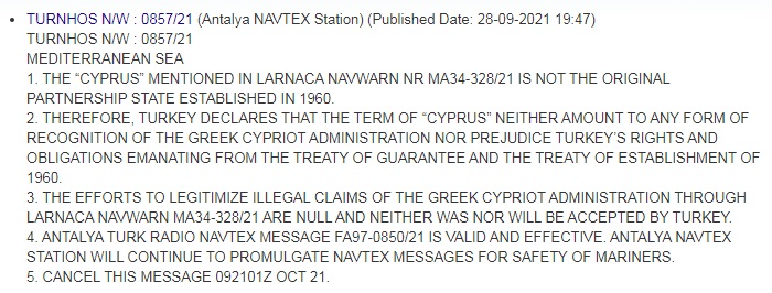 «Η «Κύπρος» που αναφέρεται στο σήμα της Λάρνακας δεν είναι το κράτος που συμβλήθηκε στη συμφωνία Treaty of Establishment το 1960… Έτσι η Τουρκία διακηρύσσει πως ο όρος «Κύπρος» δεν συνιστά αναγνώριση της ελληνοκυπριακής διοίκησης, ούτε προκαταλαμβάνει τα δικαιώματα της Τουρκίας… Οι προσπάθειες νομιμοποίησης παράνομων αξιώσεις από την ελληνοκυπριακή διοίκηση μέσω της NAVTEX της Λάρνακας είναι άκυρες και δεν γίνονται δεκτές από την Τουρκία», αναφέρει χαρακτηριστικά.