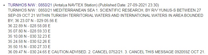 Η NAVTEX από τον σταθμό της Αττάλειας είναι η ακόλουθη:
