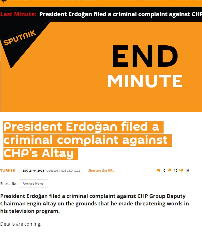 Μήνυση εναντίον του αναπληρωτή Προέδρου του κόμματος της αξιωματικής αντιπολίτευσης στην Τουρκία, Ενγκίν Αλτάι, άσκησε ο Ρετζέπ Ταγίπ Ερντογάν.