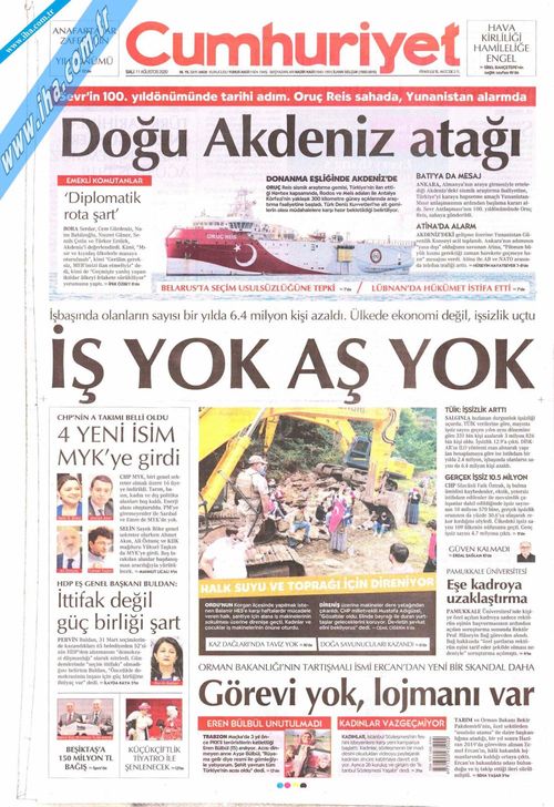 Η εφημερίδα “Cumhuriyet” γράφει: “Η επίθεση της Ανατολικής Μεσογείου”. Η εφημερίδα κάνει λόγο για ιστορικής σημασίας βήμα στην 100η επέτειο της συνθήκης των Σεβρών. “Το Oruc Reis στο μέτωπο, η Ελλάδα σε πανικό”.