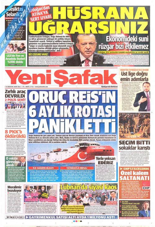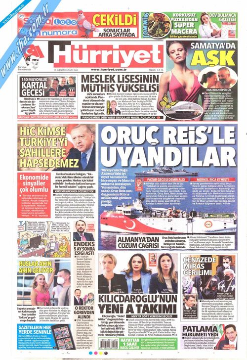 Η “Hurriyet” γράφει: “Ξύπνησαν με το Oruc Reis”. Όπως αναφέρεται στην πρώτη σελίδα της εφημερίδας, «η Ελλάδα η οποία αδιαφόρησε για τις κινήσεις καλής θέλησης της Τουρκίας και συμφώνησε με την Αίγυπτο, τώρα πανικοβλήθηκε όταν ξαφνικά είδε το πλοίο στα ανοιχτά της Κύπρου. Η Μέρκελ είχε ζητήσει να σταματήσουν οι έρευνες ως ένδειξη καλής θέλησης και η Τουρκία είχε σταματήσει. Όμως η Ελλάδα και η Αίγυπτος ξεχείλισαν το ποτήρι και η Άγκυρα πάτησε το κουμπί.