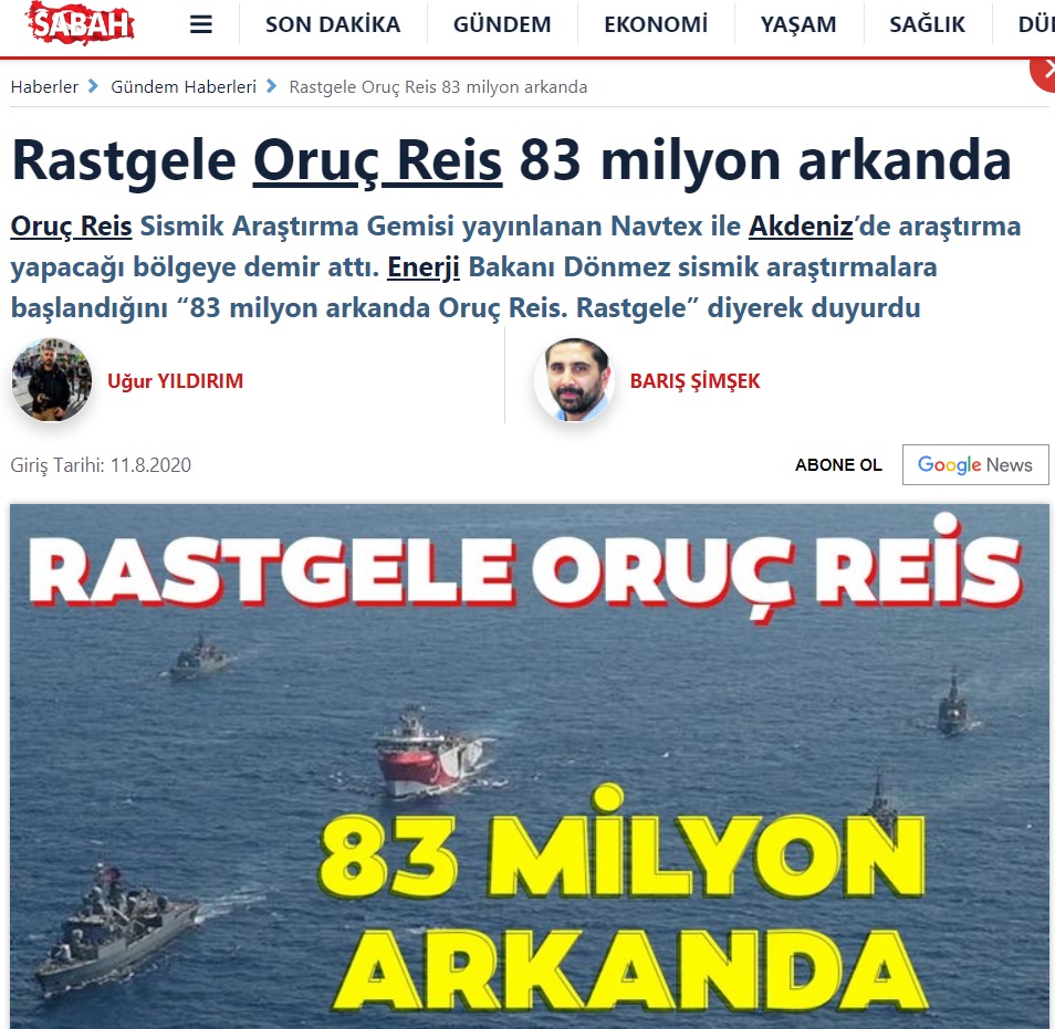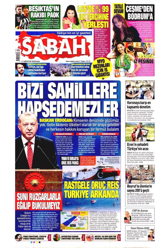 Τέλος, η “Sabah” γράφει: “Δεν μπορούν να μας φυλακίσουν στις θάλασσες μας” και εύχεται “καλή τύχη” στο Oruc Reis, λέγοντας ότι προκάλεσε πανικό στους Έλληνες και στους Ελληνοκύπριους.