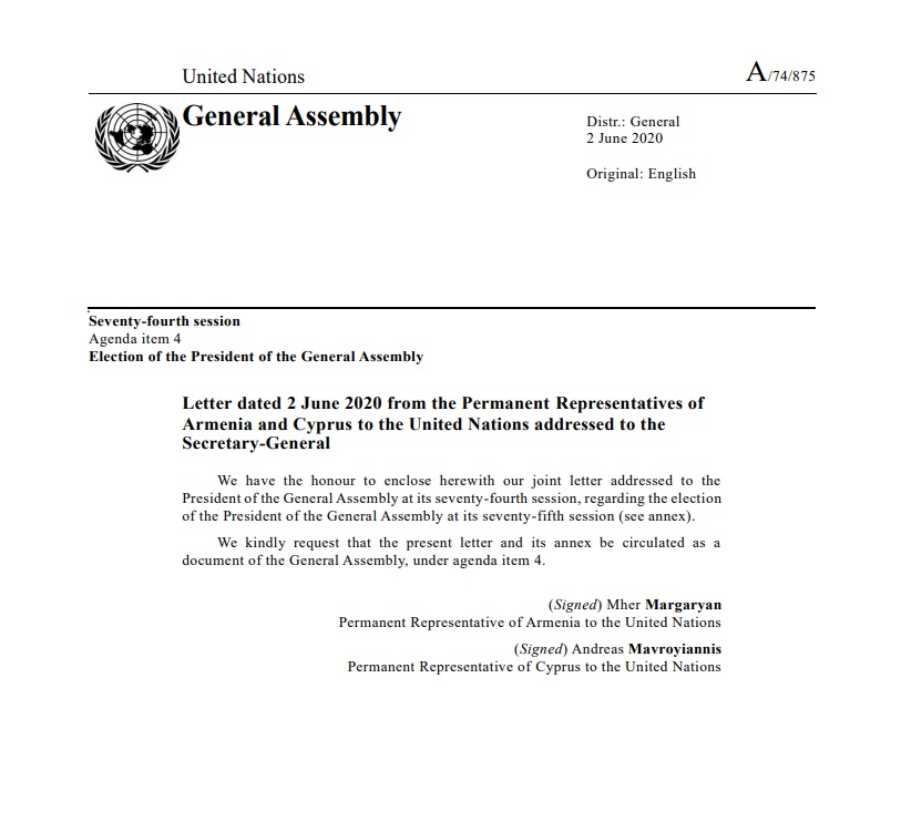 Χωρίς τη σιωπηρή αποδοχή των κρατών- μελών αλλά σε μυστική ψηφοφορία, στις 17 Ιουνίου, θα τεθεί η υποψηφιότητα του Τούρκου, Βόλκαν Μπόζκιρ, για τη θέση του προέδρου της 75ης Συνόδου της Γενικής Συνέλευσης του ΟΗΕ, μετά τις ενστάσεις που διατύπωσαν στα Ηνωμένα Έθνη οι μόνιμοι αντιπρόσωποι της Αρμενίας, της Κύπρου, της Ελλάδας και των Ηνωμένων Αραβικών Εμιράτων για τον παραβατικό και αποσταθεροποιητικό ρόλο της Τουρκίας στην ευρύτερη περιοχή.