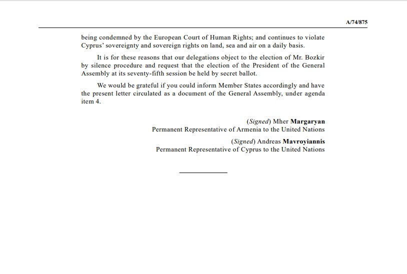 Η μοναδική υποψηφιότητα για την προεδρία της επόμενης Γενικής Συνέλευσης δεν έγινε σιωπηρά αποδεκτή διότι -όπως αναφέρουν στις επιστολές τους οι μόνιμοι αντιπρόσωποι των τεσσάρων κρατών- οι ενστάσεις δεν αφορούν προσωπικά τον κ. Μπόζκιρ, αλλά την επιθετική στάση της Τουρκίας που δε συνάδει με τους κανόνες και τις αξίες των Ηνωμένων Εθνών.