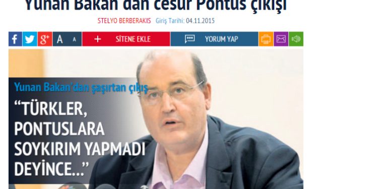 Η SABAH στο πρωτοσέλιδο αναφέρει ότι ο Υπουργός Παιδείας της Ελλάδας, Νίκος Φίλης, δήλωσε : «Είναι λάθος να λέγεται ότι οι Πόντιοι υπέστησαν γενοκτονία από τους Τούρκους». Το δημοσίευμα, συνεχίζει στις εσωτερικές σελίδες και αναφέρει: «Ο Έλληνας Υπουργός Παιδείας λέγοντας ότι Οι Τούρκοι δεν έκαναν γενοκτονία στους Πόντιους, προκάλεσε τις αντιδράσεις της Αντιπολίτευσης και ποντιακών συλλόγων».