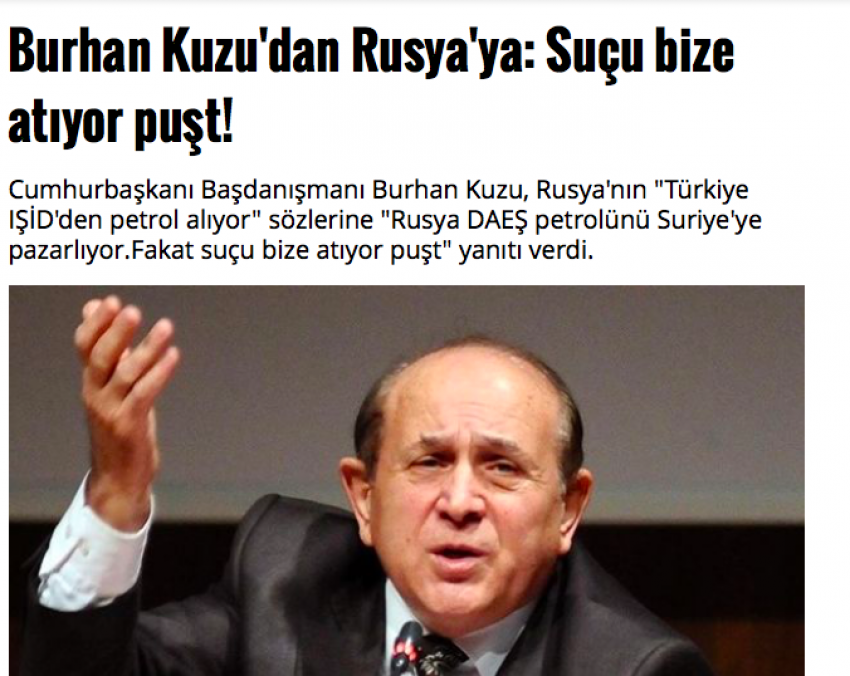 Ο εκ των κορυφαίων συμβούλων του Ερντογάν Μπουρχάν Κουζού απαντώντας στις κατηγορίες της Ρωσίας σύμφωνα με τις οποίες η Τουρκία αγοράζει πετρέλαιο από την ISIS”,αποκάλεσε τον Ρώσο Πρόεδρο ,π….η!!!