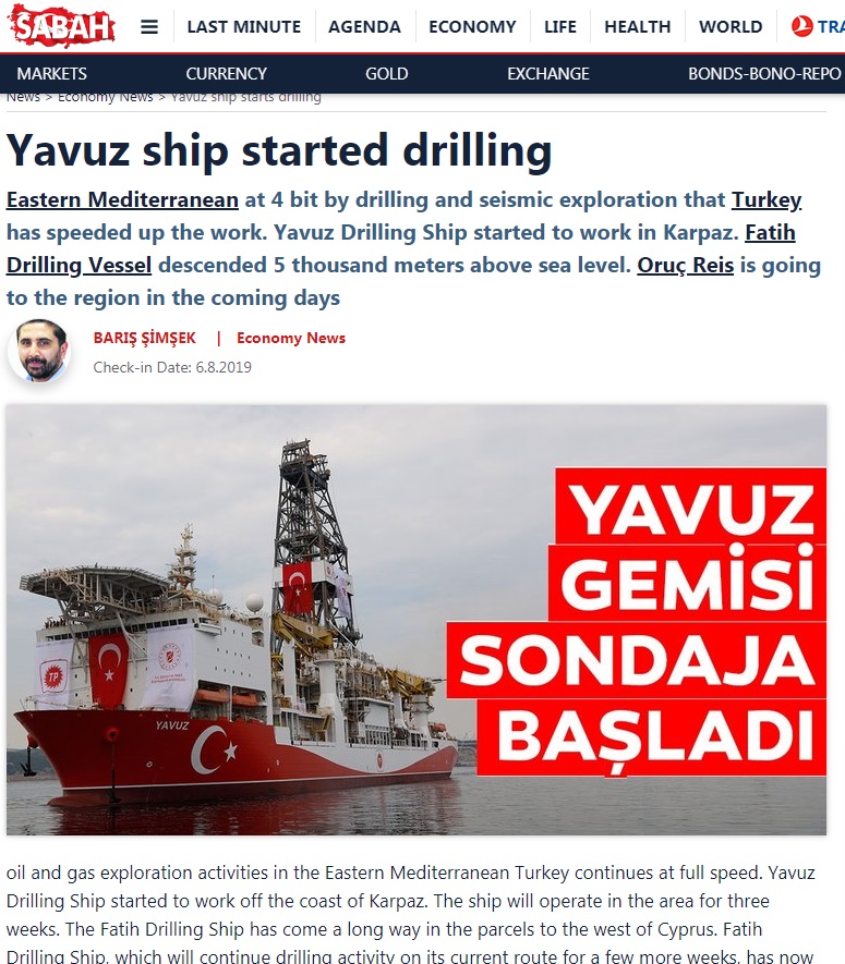 Η εφημερίδα «Σαμπάχ» αναφέρει επίσης ότι υπουργός Ενέργειας, Φατίχ Ντονμέζ, με την επίσκεψή του σήμερα στο γεωτρύπανο «Γιαβούζ» στα ανοιχτά της Καρπασίας αναμένεται να δώσει ένα μήνυμα σε όλον τον κόσμο ότι η Τουρκία δεν πρόκειται να εγκαταλείψει την Ανατολική Μεσόγειο.