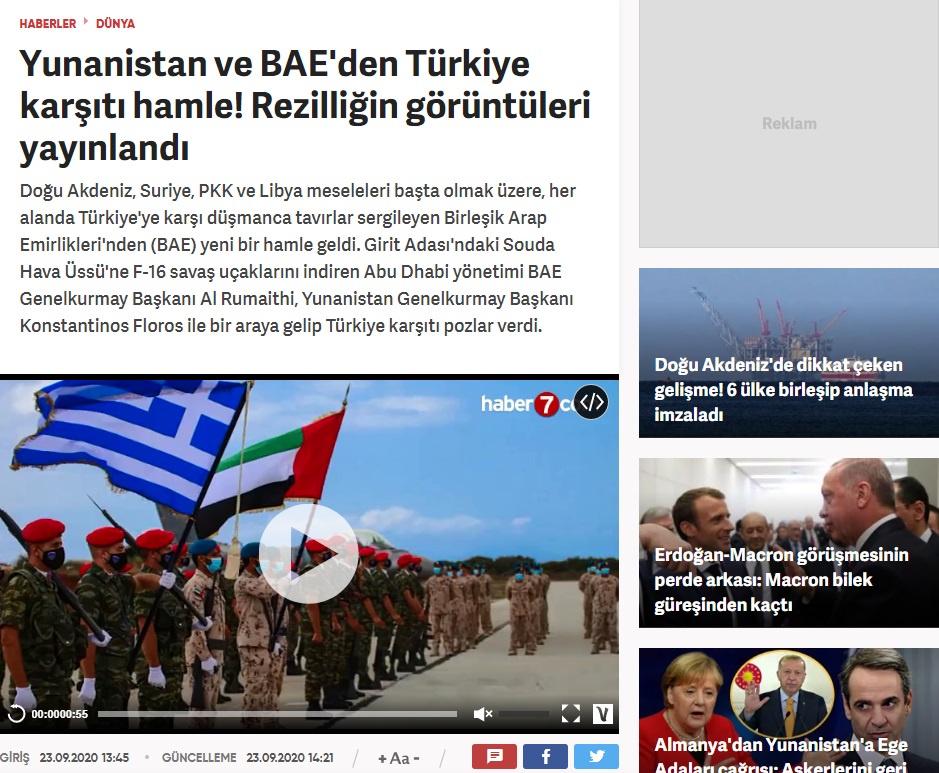 Την «σημαία» της τουρκικής προπαγάνδας κραδαίνει το κανάλι Haber7 που κάνει λόγο για αποκάλυψη των «εικόνων της ντροπής», αναδημοσιεύοντας τις φωτογραφίες που δημοσιοποίησε το ΓΕΕΘΑ από την επίσκεψη του Αρχηγού Γενικού Επιτελείου Ενόπλων Δυνάμεων των ΗΑΕ, Hamad Mohammed Thani Al Rumaithi.