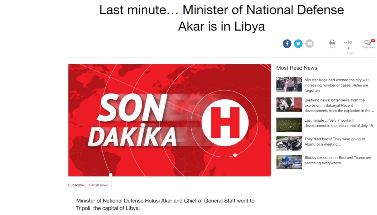 Στην πρωτεύουσα της Λιβύης βρίσκεται ο υπουργός Άμυνας της Τουρκίας, Χουλουσί Ακάρ, όπως μεταδίδουν τουρκικά ΜΜΕ.