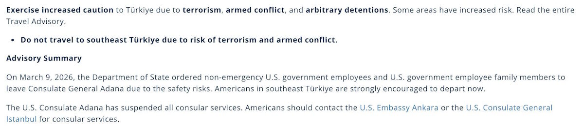 Το State Department συνιστά στους αμερικανούς πολίτες όχι μόνο να μην ταξιδεύουν στην νοτιοανατολική Τουρκία, αλλά αν βρίσκονται εκεί να την εγκαταλείψουν, εξαιτίας κινδύνων τρομοκρατίας και ένοπλων συγκρούσεων.