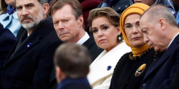Μια από τις τελετές έγινε στην Αψίδα του Θριάμβου στην καρδιά του Παρισιού με τον Ταγίπ Ερντογάν να τον… κλέβει για λίγο και την σύζυγό του Εμινέ να είναι κι εκείνη λίγο γλαρωμένη στο πλευρό του. Ίσως λένε κάποιοι να προσπαθεί με τον δείκτη του δεξιού της χεριού να τον ξυπνήσει και να μην γίνουν εντελώς ρεζίλι. Ο Ερντογάν δεν είναι η πρώτη φορά που αποκοιμιέται σε δημόσιο χώρο. Το έχει κάνει και σε συνέντευξη Τύπου πέρυσι με τον Ουκρανό ομόλογό του Ποροσένκο και φέτος με τον Μολδαβό ομόλογό του, Ντοντον.