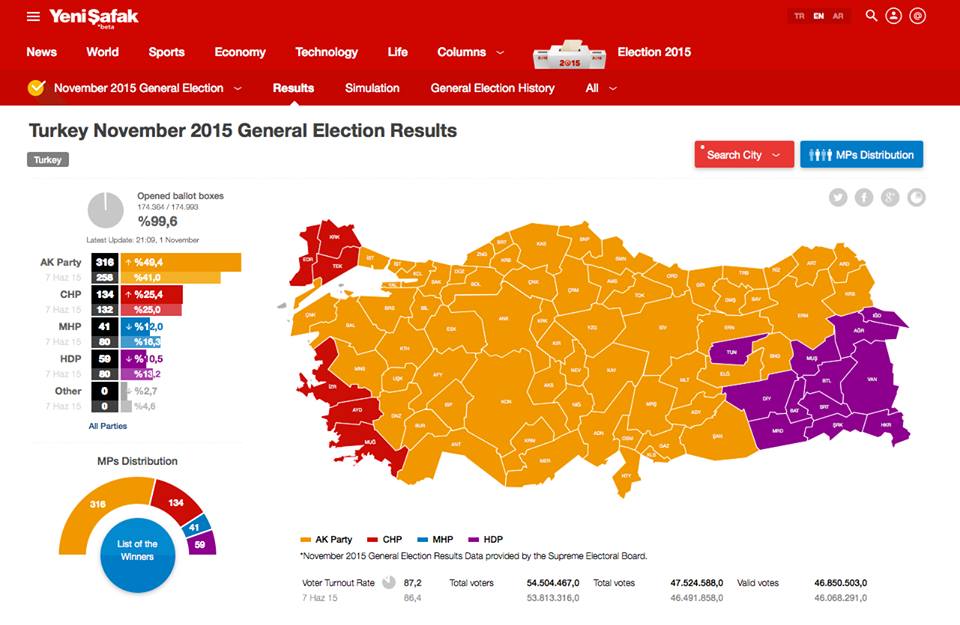 Με καταμετρημένο το 99% των ψήφων, το AKP συγκέντρωσε το 49,3% και κέρδισε 316 εκ των 550 εδρών της τουρκικής Εθνοσυνέλευσης, σύμφωνα με τα δίκτυα NTV και CNN- Turk.