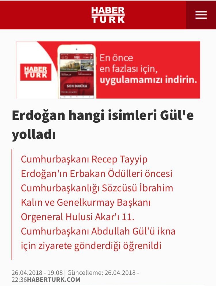 Συγκεκριμένα σύμφωνα την ιστοσελίδα της εφημερίδας Habertürk, ο πρόεδρος της Δημοκρατίας Ερντογάν για να πείσει τον Γκιούλ να μην είναι υποψήφιος στις εκλογές, έστειλε ως διαμεσολαβητές τον αρχηγό του Γενικού Επιτελείου και τον εκπρόσωπο της προεδρίας τον Ιμρπαήμ Καλίν.