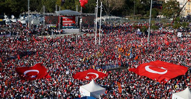 Την πρωτοβουλία για την αποψινή συγκέντρωση είχε το Ρεπουμπλικανικό Λαϊκό Κόμμα (CHP). Στην πρόσκληση ανταποκρίθηκε και το κυβερνών Κόμμα Δικαιοσύνης και Ανάπτυξης (AKP). Ομως μαζί με τις κόκκινες τουρκικές σημαίες που κατέκλυσαν την κεντρική πλατεία στης Κωνσταντινούπολης απόψε οι διαδηλωτές ύψωσαν και φωτογραφίες του Μουσταφά Κεμάλ Ατατούρκ, του πατέρα της τουρκικής δημοκρατίας.