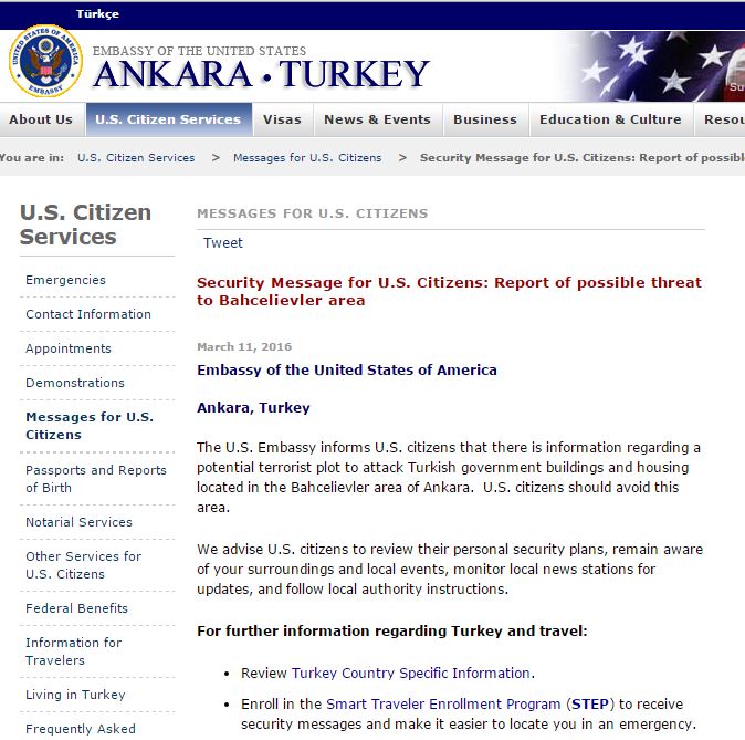 Παρέπεμπε δε, στην ιστοσελίδα της Αμερικανικής πρεσβείας στην Άγκυρα η οποία έκανε λόγο για σχεδιαζόμενη επίθεση σε τουρκικά κυβερνητικά κτίρια και συνιστούσε τους Αμερικανούς πολίτες να μην προσεγγίζουν την περιοχή και να μην συμμετέχουν σε εκδηλώσεις.