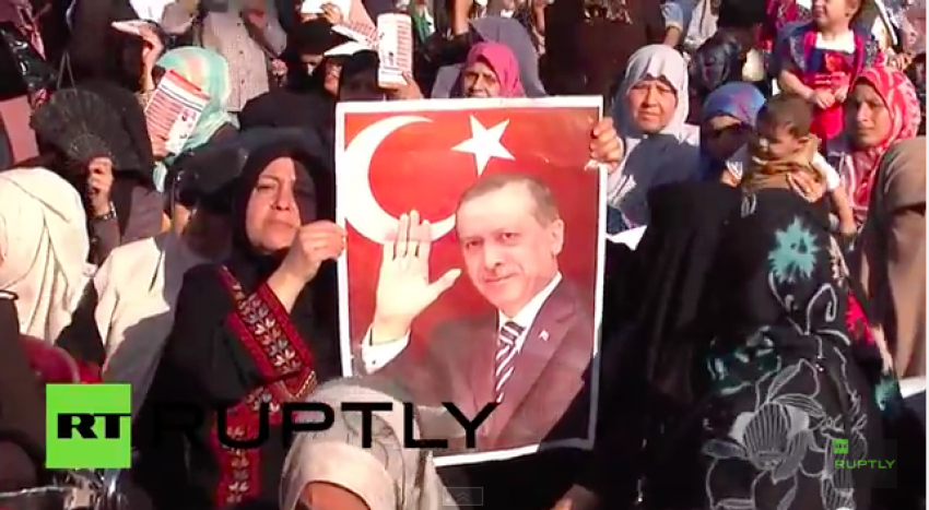 Τα πλάνα στο βίντει δείχνουν χιλιάδες άνδρες να φορούν κασκόλ με τη λέξη Παλαιστίνη γραμμένη στην αγγλική γλώσσα και να κυματίζουν τουρκικές σημαίες και αφίσες με το πρόσωπο του τούρκυ προέδρου Ρετζέπ Ταγίπ Ερντογάν Ερντογάν.
