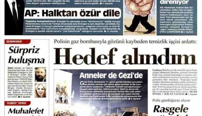«Ασύμμετρη οργή» είναι ο τίτλος της Cumhuriyet. H τουρκική εφημερίδα αναφέρει πως «ο Ερντογάν δεν αναγνωρίζει ούτε τον λαό, ούτε τη δικαιοσύνη, ούτε τη δημοκρατία αλλά ούτε τη διεθνή κοινότητα». Η εφημερίδα αναφέρει πως ο τούρκος πρωθυπουργός δήλωσε πως δεν αναγνωρίζει την απόφαση του Ευρωπαϊκού Κοινοβουλίου που καταδικάζει την Τουρκία.