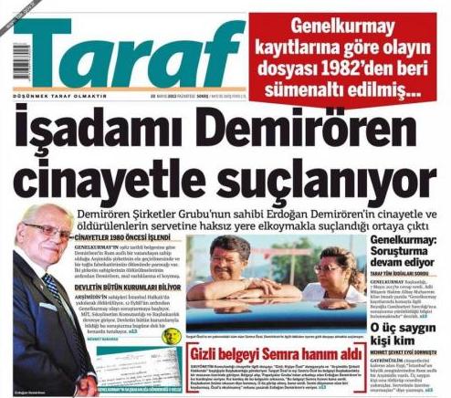 “O Nτεμίρορεν κατηγορείται για δολοφονία» είναι ο τίτλος της τουρκικής εφημερίδας. Η Taraf αναφέρεται σε ντοκουμέντα από την έρευνα του Γενικού Επιτελείου Στρατού το 1982 (σ.σ. ήταν στην εξουσία τη στρατιωτική χούντα) , όπου αναφέρεται πως υπάρχουν στοιχεία που εμπλέκουν τον τούρκο επιχειρηματία στην υπόθεση της δολοφονίας του ιδιοκτήτη της εταιρείας Αρχιμήδης ( έλληνας ο ιδιοκτήτης) και ενός άλλου επιχειρηματία εργοστασίου τούβλων. Μετά τις δολοφονίες των δυο το 1978 ο Ντεμίρορεν, με τη βοήθεια των δικηγόρων των δολοφονηθέντων επιχειρηματιών, πήρε στην ιδιοκτησία του και τις δυο εταιρείες!
