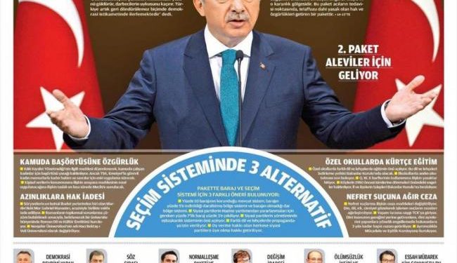 « Η επανάσταση του Ερντογάν» είναι ο τίτλος της Αkşam που αναφέρεται στο πακέτο εκδημοκρατισμού της Τουρκίας το οποίο ανακοίνωσε ο Ρετζέπ Ταγίπ Ερντογάν. « Με το μανιφέστο της 30ης Σεπτεμβρίου θα γεννηθεί μια νέα Τουρκία. Καθώς με τα μέτρα που ανακοίνωσε ο Ερντογάν θα προκύψουν πολιτικές, θρησκευτικές και κοινωνικές ελευθερίες όπως και δικαιώματα για τις μειονότητες».