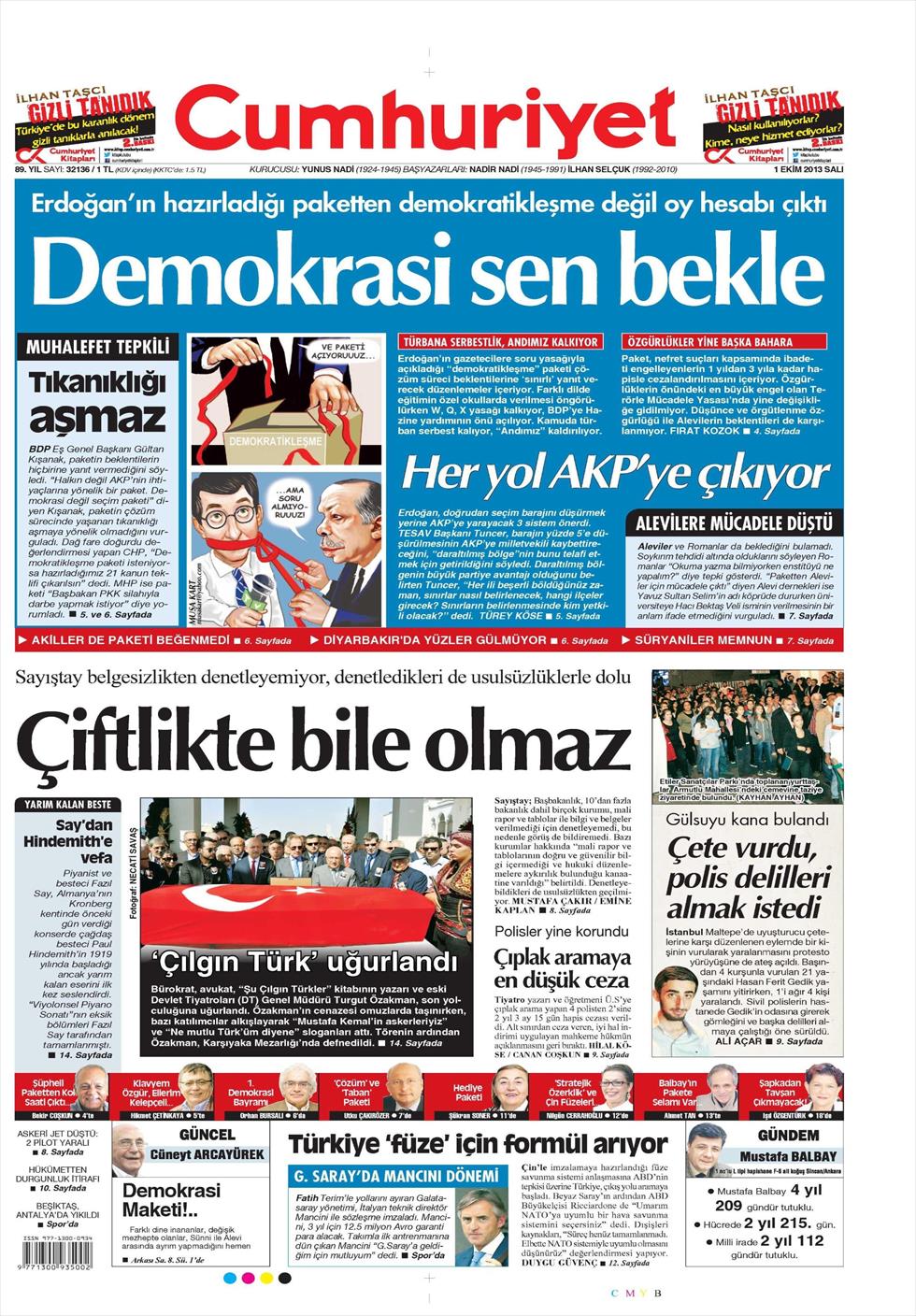 «Δημοκρατία! Εσύ να περιμένεις» είναι ο τίτλος της Cumhuriyet. H τουρκική εφημερίδα θεωρεί πως το πακέτο του Ερντογάν δεν εκδημοκρατίζει τη χώρα. « Από το πακέτο δεν βγήκε ο εκδημοκρατισμός αλλά η ψηφοθηρία» . Η τουρκική εφημερίδα τονίζει πως η άρση της απαγόρευσης της ισλαμικής μαντίλας στο δημόσιο είναι το βασικό μέτρο που στήριξε ο τούρκος πρωθυπουργός. Η ίδια εφημερίδα υπενθυμίζει πως στη συνέντευξη Τύπου για το πακέτο εκδημοκρατισμού απαγορεύθηκαν οι ερωτήσεις προς τον τούρκο πρωθυπουργό!