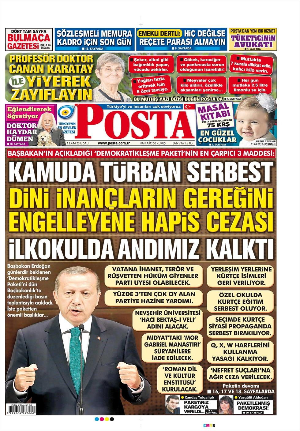 «Τα πιο εντυπωσιακά τρία σημεία του πακέτου» είναι ο τίτλος της Posta που αναφέρεται πως με το πακέτο εκδημοκρατισμού του Ερντογάν « απελευθερώνεται η ισλαμική μαντίλα στο δημόσιο, επιβάλλεται ποινή φυλάκισης σε όσους εμποδίζουν ανθρώπους που θέλουν να ικανοποιήσουν τις θρησκευτικές τους υποχρεώσεις, θα αρθεί ο όρκος του τούρκου πολίτη από τα δημοτικά σχολεία».