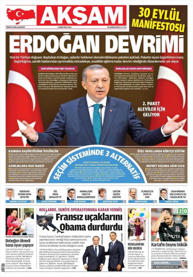 « Η επανάσταση του Ερντογάν» είναι ο τίτλος της Αkşam που αναφέρεται στο πακέτο εκδημοκρατισμού της Τουρκίας το οποίο ανακοίνωσε ο Ρετζέπ Ταγίπ Ερντογάν. « Με το μανιφέστο της 30ης Σεπτεμβρίου θα γεννηθεί μια νέα Τουρκία. Καθώς με τα μέτρα που ανακοίνωσε ο Ερντογάν θα προκύψουν πολιτικές, θρησκευτικές και κοινωνικές ελευθερίες όπως και δικαιώματα για τις μειονότητες».