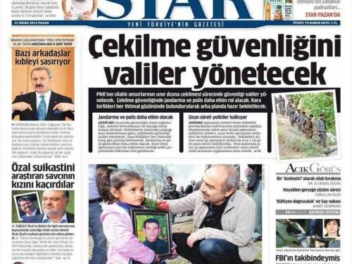 «Την αποχώρηση θα τη διευθύνουν οι νομάρχες» είναι ο τίτλος της Star. H τουρκική εφημερίδα αναφέρει πως ολη την επιχείρηση της αποχώρησης των ανταρτών του PKK από την Τουρκία θα τη διευθύνουν οι νομάρχες των πόλεων. Παράλληλα σημαντικό ρόλο για την ασφάλεια θα παίζουν οι αστυνομικοί και οι άνδρες της στρατοχωροφυλακής. Όπως γράφει η εφημερίδα ο τουρκικός στρατός θα βρίσκεται σε επιφυλακή όμως σε μεγάλη απόσταση για κάθε ενδεχόμενο.