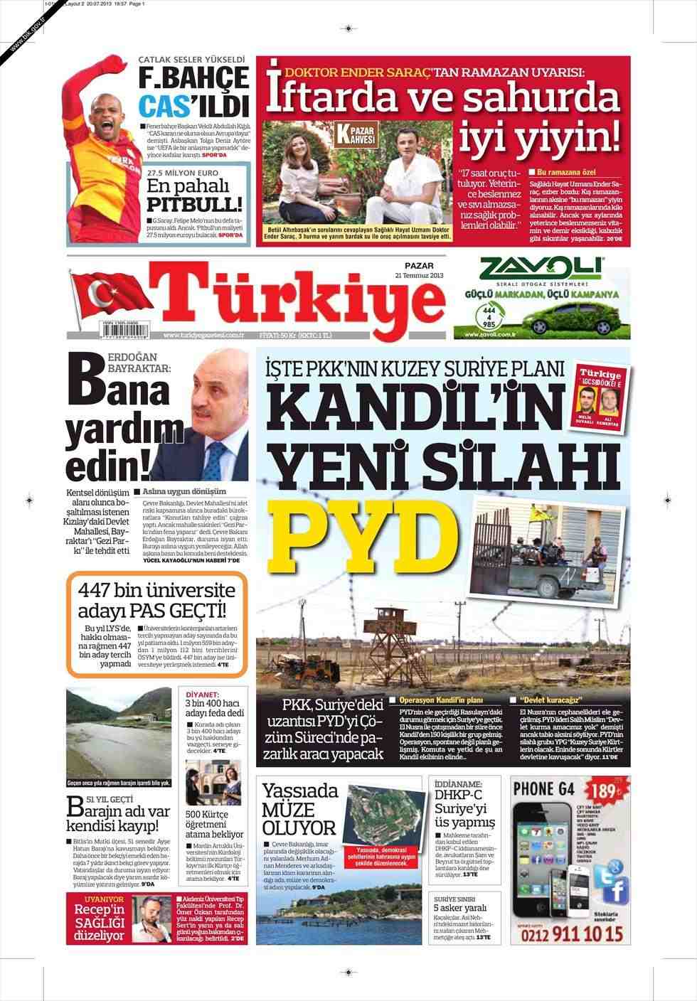 «Το νέο όπλο του Kαντίλ είναι το PYD» είναι ο τίτλος της Türkiye. H τουρκική εφημερίδα αναφέρει πως η ηγεσία των Κούρδων θα χρησιμοποιήσει ως διαπραγματευτικό όπλο , την παρουσία της κουρδικής οργάνωσης στη βόρεια Συρία, στις διαπραγματεύσεις με την Τουρκία σε σχέση με τη διαδικασία της επίλυσης του Κουρδικού προβλήματος.
