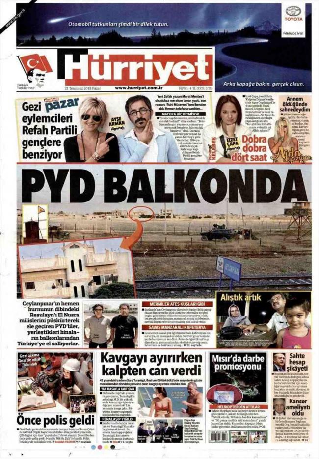 «Το PYD είναι στο μπαλκόνι» είναι ο τίτλος της Hürriyet. H τουρκική εφημερίδα αναφέρει πως αντάρτες της οργάνωσης PYD ( το παρακλάδι του PKK στη Συρία) αφού έδιωξαν του αντάρτες της Αλ Νουσρα , ανέβηκαν στα μπαλκόνια σπιτιών και άρχισαν να κάνουν σόου απέναντι από τα σύνορα της Τουρκίας.