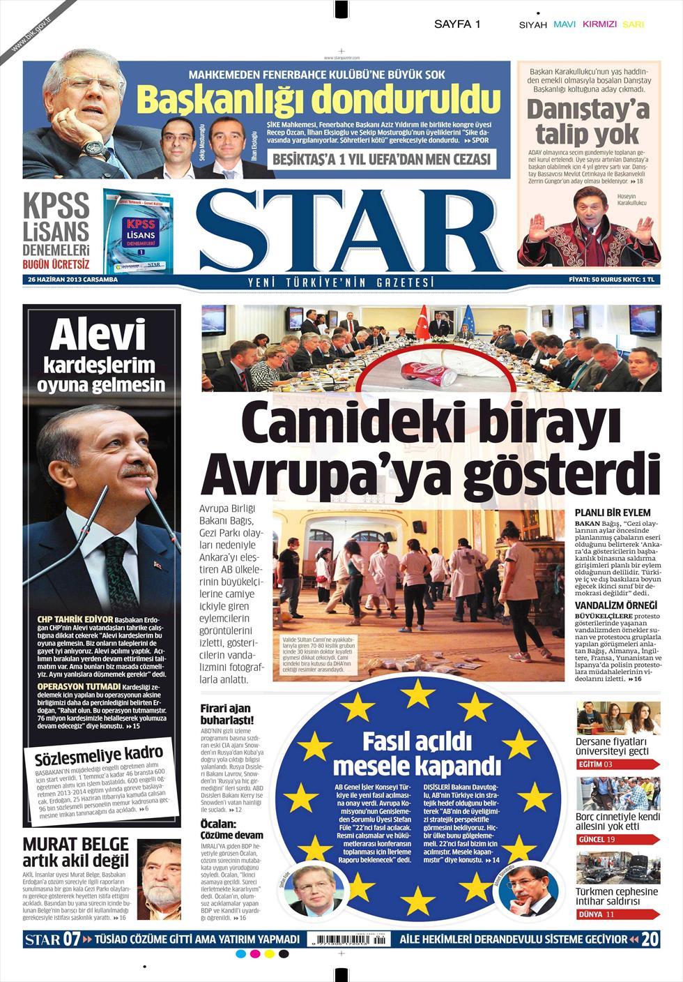 «Σε όλη την Ευρώπη έδειξε τη μπίρα στο τζαμί» είναι ο τίτλος της Star. H τουρκική εφημερίδα γράφει πως ο υπουργός Ε.Ε. Εγκεμέν Μπαγίς κάλεσε όλους του πρέσβεις των Ευρωπαϊκών χωρών και τους έδειξε βίντεο εισβολής διαδηλωτών σε τζαμί με τον ισχυρισμό πως έπιναν και μπίρες.