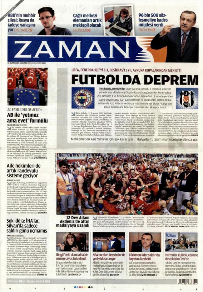 «Σεισμός στο ποδόσφαιρο» είναι ο τίτλος της Zaman. H τουρκική εφημερίδα αναφέρεται στον αποκλεισμό δυο ποδοσφαιρικών ομάδων από την πλευρά της UEFA. H Φενέρμπαχτσε για τρία χρόνια η Μπεσίκτας για έναν χρόνο δεν θα μπορούν να συμμετέχουν σε ευρωπαϊκές διοργανώσεις.