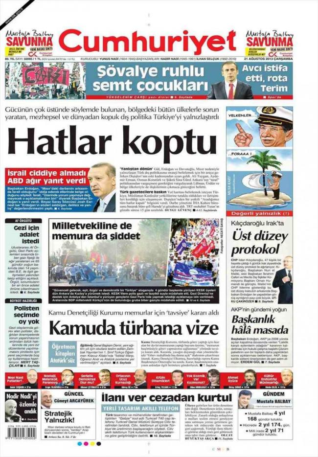 « Κόπηκαν οι κάβοι» είναι ο τίτλος της τουρκικής εφημερίδα που αναφέρει πως « η Τουρκία έμεινε μόνη καθώς κάνει δηλώσεις πιο σκληρές από τη δύναμη της , δημιουργεί προβλήματα με όλους, δημιουργεί θρησκευτικές και δογματικές διχόνοιες, εφαρμόζει εξωτερική πολιτική που είναι απομονωμένη από τους άλλους, ».