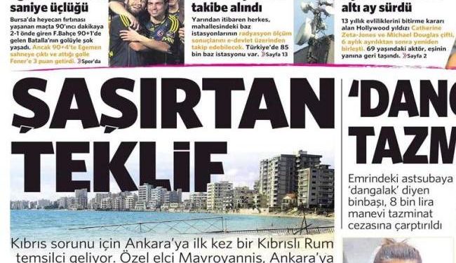“ H πρόταση που εκπλήσσει»είναι ο τίτλος του πρωτοσέλιδου τίτλου της τουρκικής εφημερίδας και αναφέρει πως «για πρώτη φορά φτάνει στην Άγκυρα απεσταλμένος των ελληνοκυπρίων. Ο Aνδρέας Μαυρογιάννης ανακοίνωσε πως θα έχει μια πρόταση έκπληξη για τα Βαρώσια».