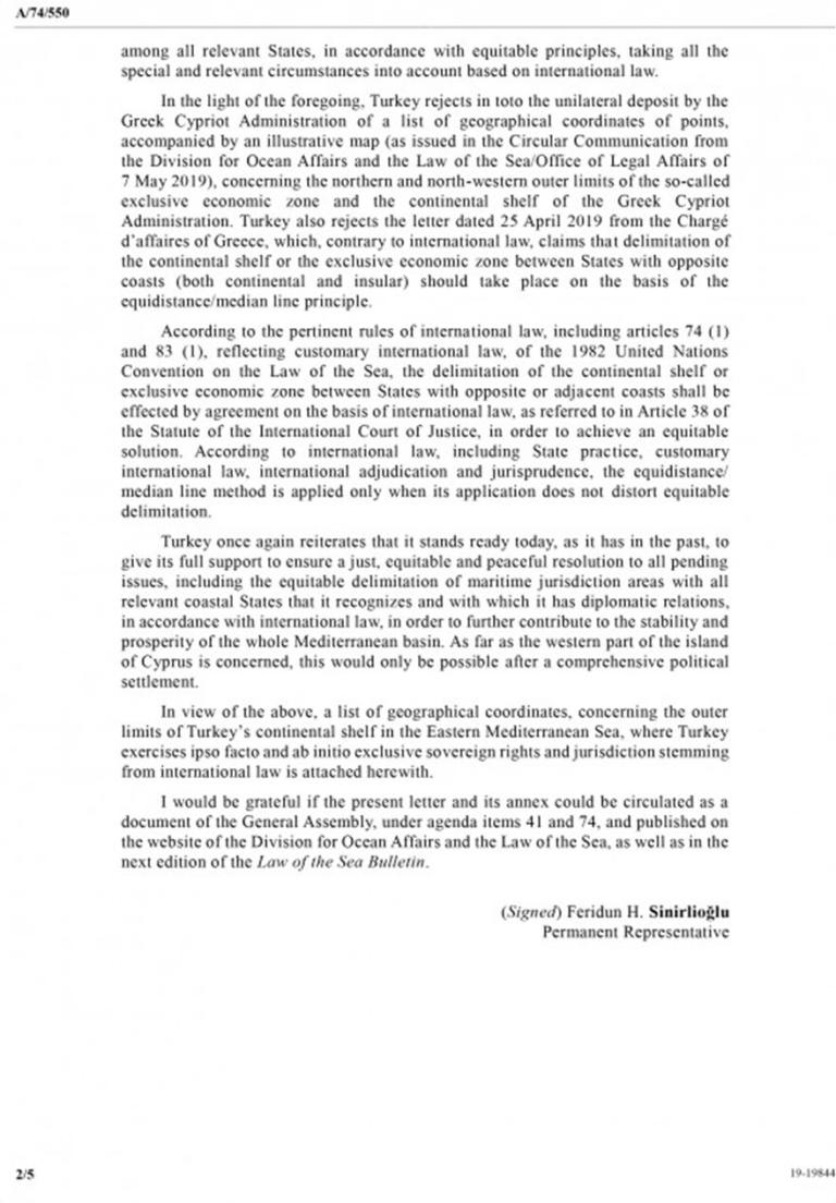 «Η Τουρκία επαναλαμβάνει για άλλη μια φορά ότι είναι έτοιμη σήμερα, όπως και στο παρελθόν, να υποστηρίξει πλήρως την εξασφάλιση δίκαιης, ισότιμης και ειρηνικής επίλυσης όλων των υπό εκκρεμότητα ζητημάτων, συμπεριλαμβανομένης της δίκαιης οριοθέτησης των περιοχών θαλάσσιας δικαιοδοσίας με όλα τα σχετικά παράκτια κράτη που αναγνωρίζει και με τα οποία έχει διπλωματικές σχέσεις, σύμφωνα με το διεθνές δίκαιο, προκειμένου να συμβάλει περαιτέρω στη σταθερότητα και την ειρήνη και ευημερία ολόκληρης της λεκάνης της Μεσογείου. Όσον αφορά στο δυτικό τμήμα της Κύπρου, αυτό θα ήταν δυνατό μόνο μετά από μια συνολική πολιτική διευθέτηση», γράφει η επιστολή.