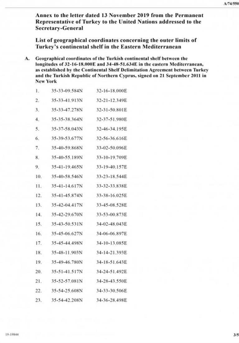Τέλος , απορρίπτει τον χάρτη με τις συντεταγμένες που έχει καταθέσει η Κυπριακή Κυβέρνηση από τις 25 Απριλίου 2019.