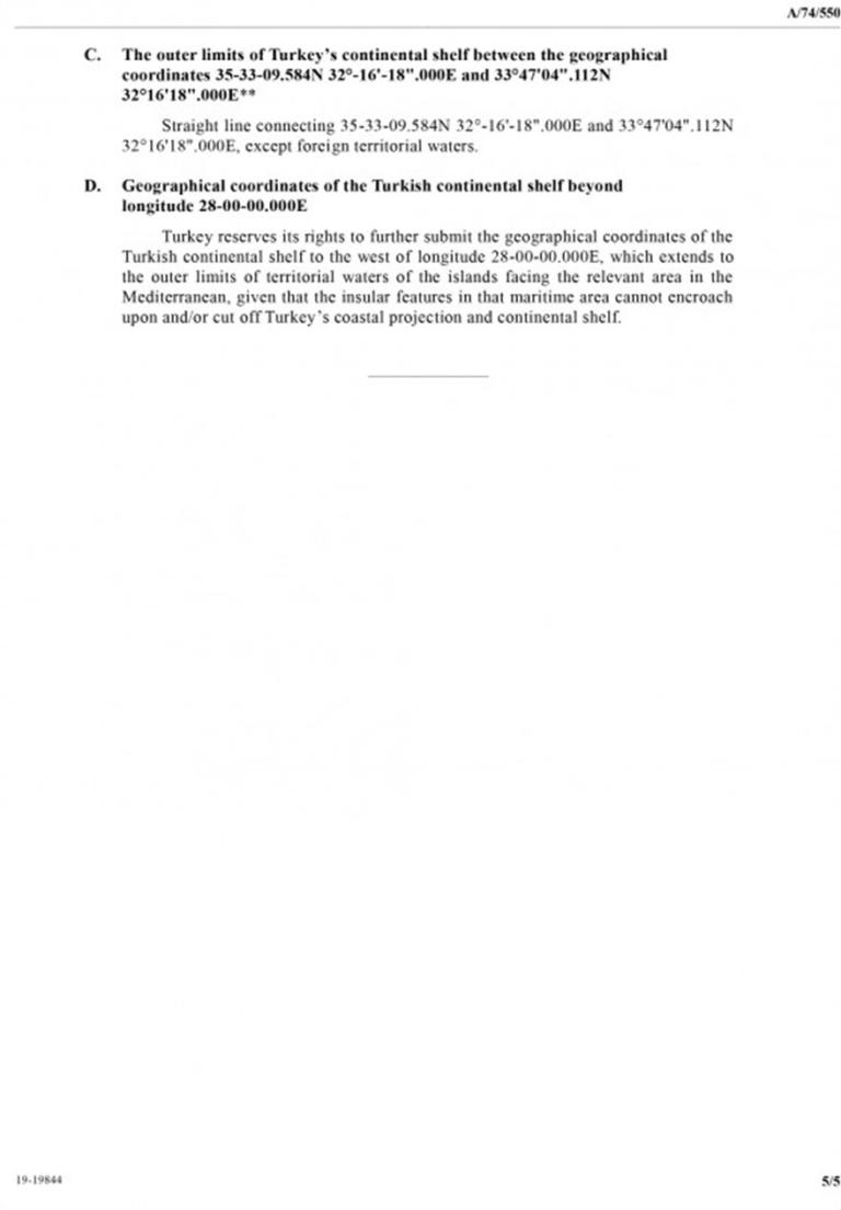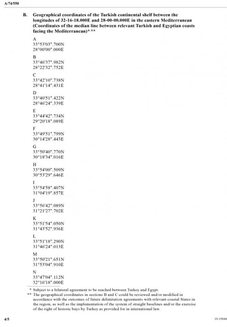 «Όπως επανέλαβε η Τουρκία σε διάφορες περιστάσεις, η οριοθέτηση της αποκλειστικής οικονομικής ζώνης και της ηπειρωτικής υφαλοκρηπίδας, πέραν των δυτικών τμημάτων του γεωγραφικού μήκους 32 ° 16’18 “E, θα πρέπει να πραγματοποιείται σε συμφωνία μεταξύ των επηρεαζόμενων κρατών στην περιοχή, με βάση την αρχή της ισότητας με στόχο την επίτευξη ισότιμης οριοθέτησης. Από αυτή την άποψη, βάσει του διεθνούς δικαίου, η Τουρκία θεωρεί ότι τα εξωτερικά όρια της τουρκικής υφαλοκρηπίδας στις προαναφερθείσες θαλάσσιες περιοχές ακολουθούν τη διάμεση γραμμή μεταξύ των ακτών της Τουρκίας και της Αιγύπτου σε σημείο που θα προσδιοριστεί δυτικά των 28 ° 00’00 “E, σύμφωνα με την αποτέλεσμα των μελλοντικών συμφωνιών οριοθέτησης στο Αιγαίο, καθώς και στη Μεσόγειο, μεταξύ όλων των συμβαλλόμενων κρατών, σύμφωνα με δίκαιες αρχές, λαμβάνοντας όλες τα ειδικές και σχετικές περιστάσεις βάσει του διεθνούς δικαίου», αναφέρει χαρακτηριστικά στην επιστολή.