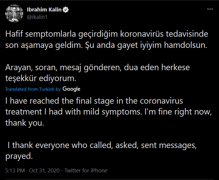 Ο Ιμπραήμ Καλίν, εκπρόσωπος και στενός συνεργάτης του προέδρου της Τουρκίας Ρετζέπ Ταγίπ Ερντογάν, ενημέρωσε ότι έχει προσβληθεί από τον SARS-CoV-2.