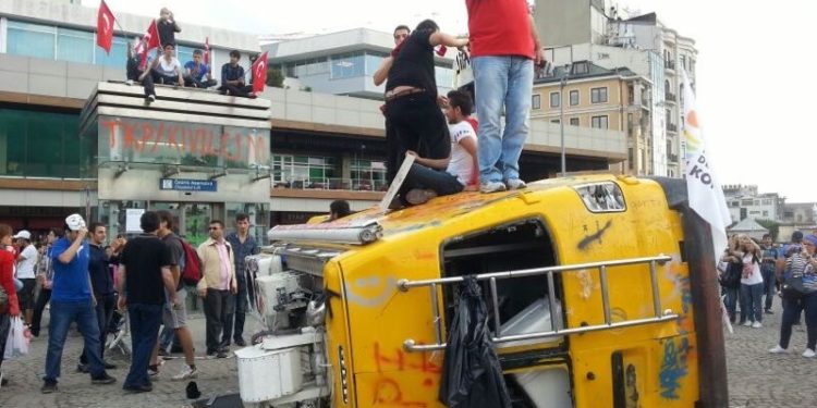 Τούρκοι διαδηλωτές στην πλατεία Ταξίμ επιτέθηκαν σε οχήματα των τουρκικών τηλεοπτικών δικτύων και τα πυρπόλησαν. Μεγαλύτερη αντίδραση υπήρξε στο όχημα δορυφορικών μεταδόσεων του τηλεοπτικού δικτύου NTV.