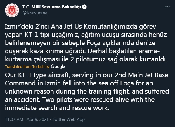 «Αεροσκάφος KT-1, που εκτελούσε υπηρεσία σε βάση της 2η Διοίκησης στη Σμύρνη, έπεσε στη θάλασσα ανοικτά της Foca για απροσδιόριστο λόγο κατά τη διάρκεια εκπαιδευτικής πτήσης. Κατά την έρευνα και τη διάσωση που ξεκίνησε αμέσως, οι 2 πιλότοι μας διασώθηκαν σώοι».