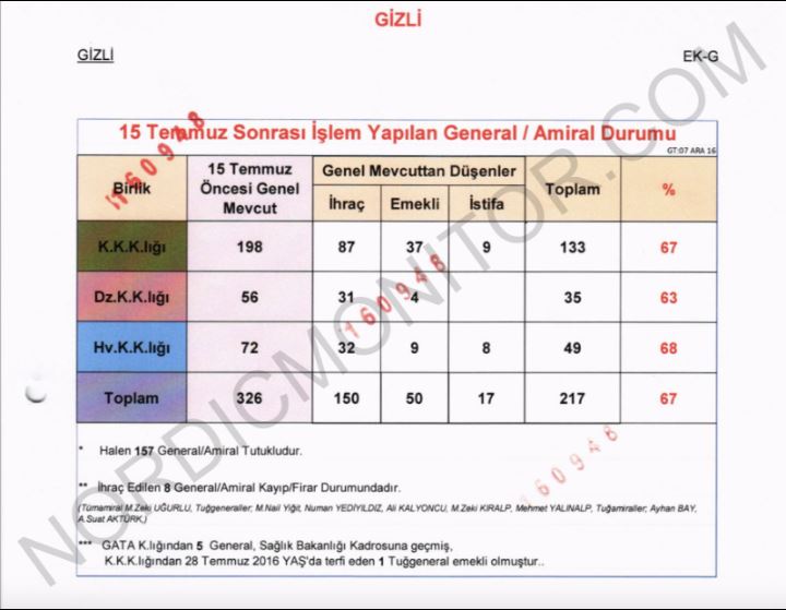 Σύμφωνα με το έγγραφο, από τους 217 Ανώτατους Αξιωματικούς (Στρατηγοί/Πτέραρχοι/Ναύαρχοι) , οι οποίοι αποτελούν στο 67% όλων των αξιωματικών σημαίας του τουρκικού στρατού, οι 150 έχουν απαλλαχθεί από τα καθήκοντά τους και οι 50 έχουν αποστρατευτεί από τις 7 Δεκεμβρίου 2016.