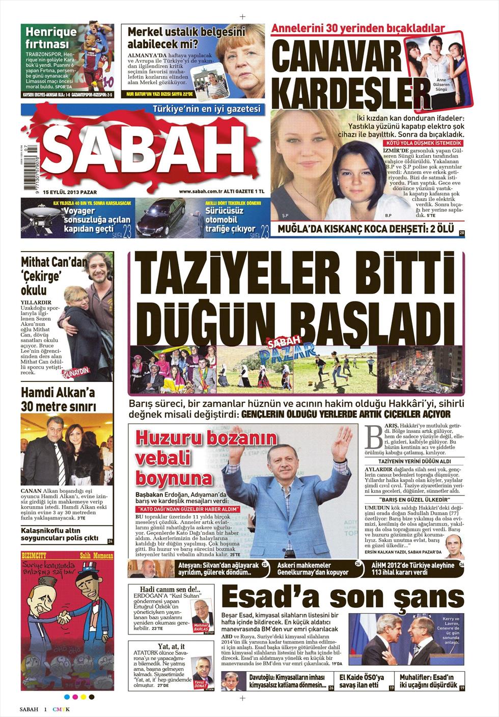 «Τελείωσαν τα συλλυπητήρια και ξεκίνησαν οι γάμοι» είναι ο τίτλος της Sabah που υποστηρίζει πως στην επαρχία Χακάρι της νοτιοανατολικής Τουρκίας όπου λόγω της εκεχειρίας με το PKK δεν γίνονται πια μάχες ούτε υπάρχουν θύματα λόγω των συγκρούσεων.