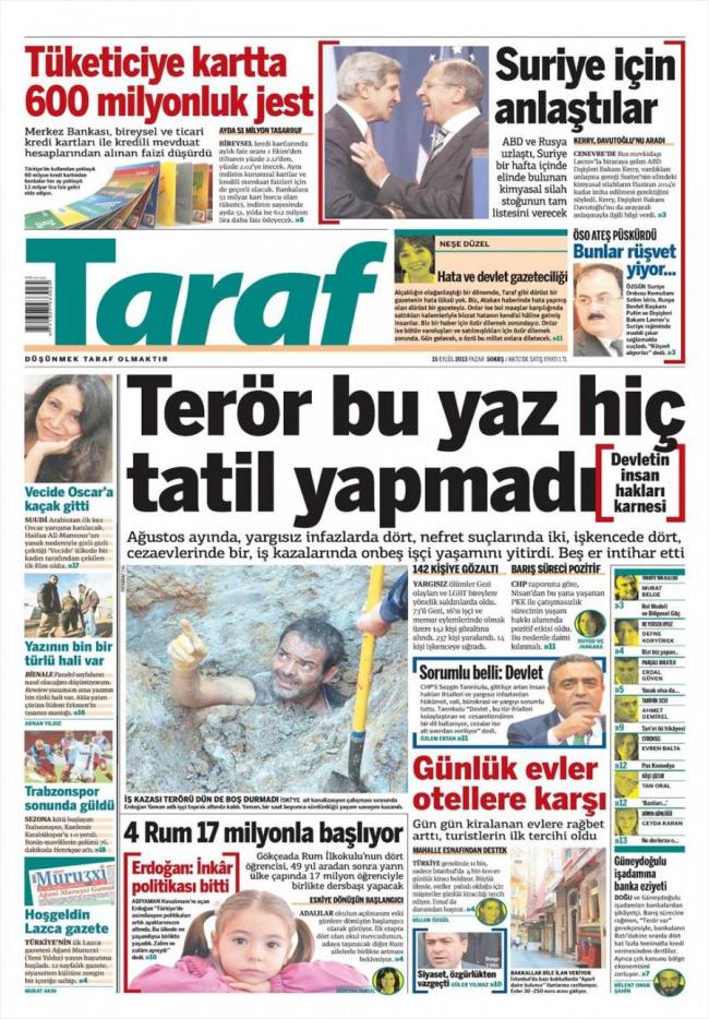 «Η τρομοκρατία φέτος το καλοκαίρι δεν έκανε διακοπές» είναι ο τίτλος της Taraf και «βαθμολογεί τα ανθρώπινα δικαιώματα στην Τουρκία». Σύμφωνα με την τουρκική εφημερίδα τον φετινό Αύγουστο, 4 άνθρωποι σκοτώθηκαν από βασανιστήρια, 5 στρατιώτες αυτοκτόνησαν όπως και 15 εργάτες έχασαν τη ζωή τους την ώρα της εργασίας τους.