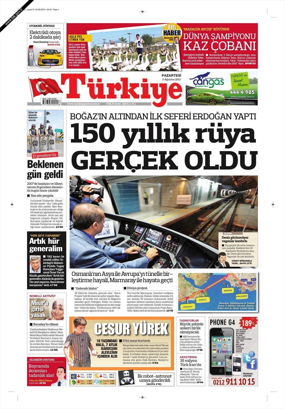 «Εγινε πραγματικότητα ένα όνειρο 150 ετών» είναι ο τίτλος της Turkiye. H τουρκική εφημερίδα αναφέρει πως » ο Ερντογάν ήταν αυτός που πραγματοποίησε το πρώτο ταξίδι στο υποθαλάσσιο τούνελ. Το όνειρο των Οθωμανών για διέυλευση του Βοσπόρου κάτω απο τη θάλασσα έγινε πραγματικότητα με το σχέδιο Marmaray» .