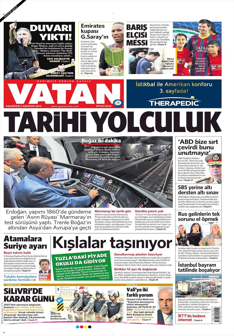 » Ιστορικό ταξίδι» είναι ο τίτλος της Vatan. H τουρκική εφημερίδα αναφέρεται στο ταξίδι του Ερντογάν στο υποθαλάσσιο τούνελ στο Βόσπορο. » Ηταν ένα σχέδιο που είχε ανακοινωθεί για πρώτη φορά το 1860. Ο Ερντογάν πραγματοποίησε το πρώτο ταξίδι και οδήγησε το τρένο μέσα στο υποθαλάσσιο τούνελ».