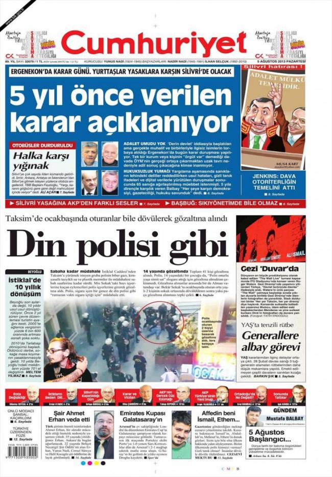 «Θα ανακοινωθεί η απόφαση που ελήφθη πριν απο 5 χρόνια» είναι ο τίτλος της Cumhuriyet. Η τουρική εφημερίδα αναφέρεται στην ετυμηγορία που θα ανακοινωθεί σχετικά με την οργάνωση της Εργεκενεκόν. » Κανένας κατηγορούμενος δεν έχει ομολογήσει πως υπάρχει μια οργάνωση όμως το δικαστήριο θα ανακοινώσει την ετυμηγορία του» γράφει η εφημερίδα.