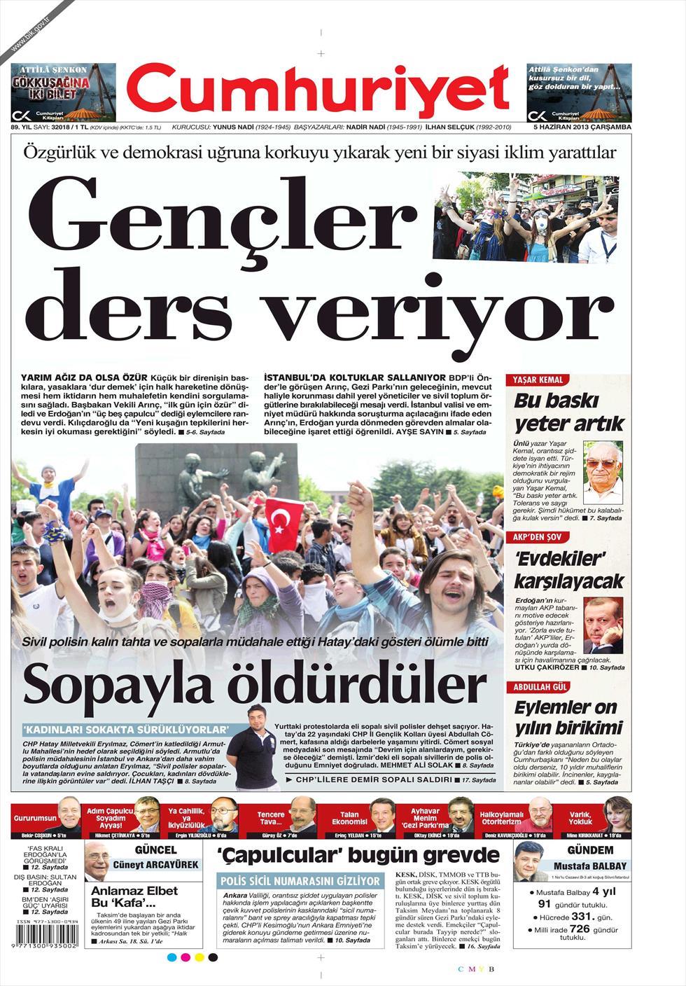 «Οι νέοι παραδίδουν μάθημα» είναι ο τίτλος της Cumhuriyet. «Νίκησαν τον φόβο άλλαξαν το κλίμα στο όνομα της δημοκρατίας και της ελευθερίας» σχολιάζει η τουρκική εφημερίδα. “ O αντιπρόεδρος της κυβέρνησης έδωσε ραντεβού για να συναντηθεί με τους διαδηλωτές που ο Ερντογάν τους είχε αποκαλέσει πλιατσικολόγους».