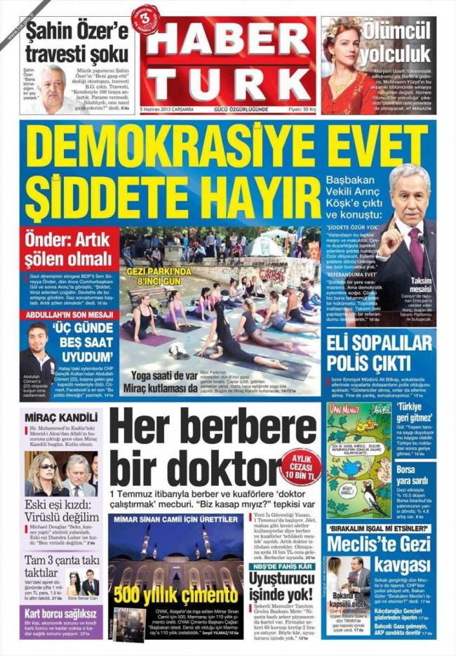 « Ναι στη δημοκρατία, όχι στη βία» είναι ο τίτλος της Habertürk. H τουρκική εφημερίδα αναφέρεται σε δηλώσεις του αντιπροέδρου της κυβέρνησης Μπουλέντ Αρίντς « ο οποίος έκανε δηλώσεις μετά τη συνάντηση του με τον πρόεδρο Γκιουλ. Οι δηλώσεις ηρέμησαν το κλίμα».