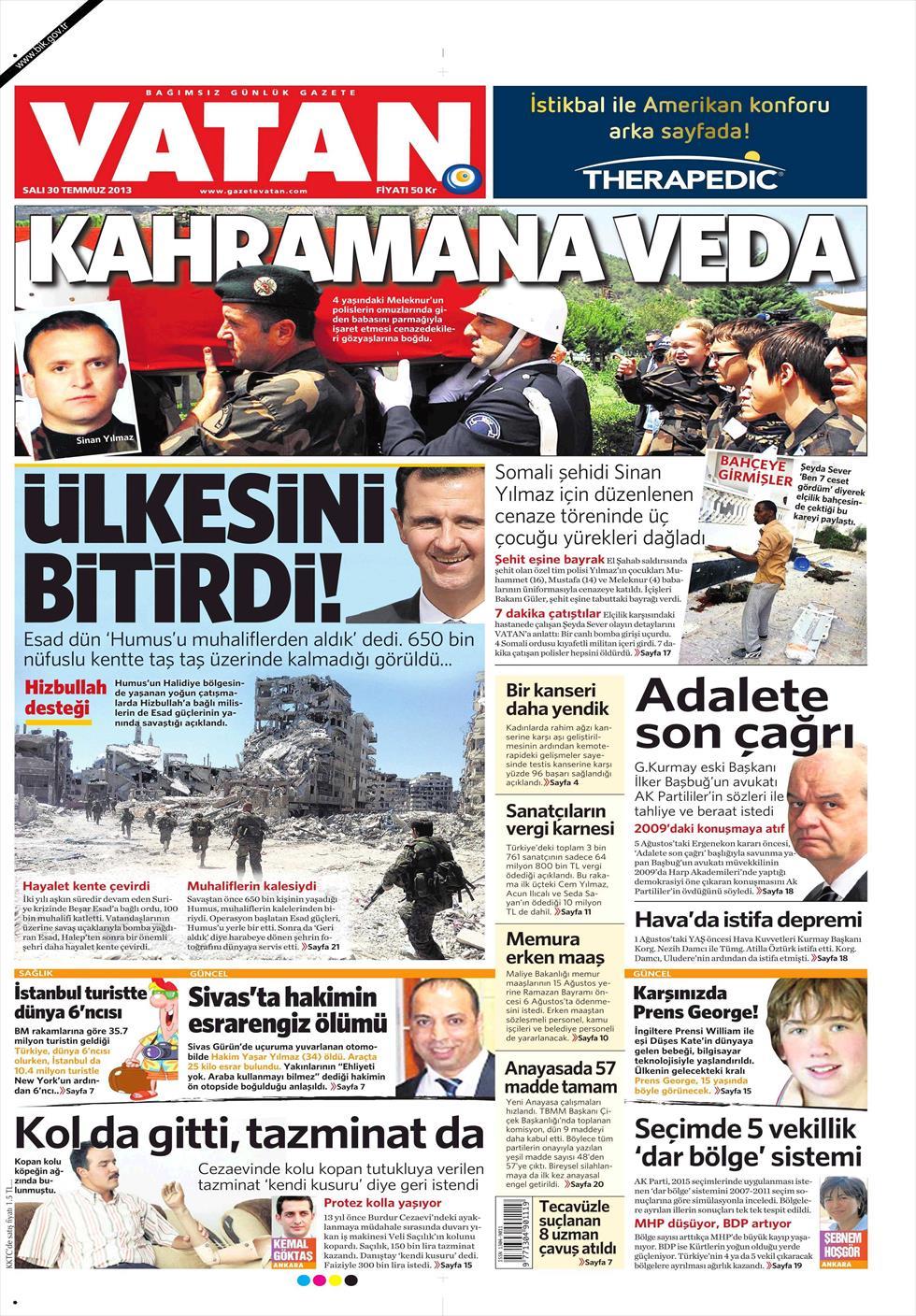 «Τελείωσε τη χώρα του» είναι ο τίτλος της Vatan. H τουρκική εφημερίδα αναφέρει πως οι δυνάμεις του Άσαντ ανακατέλαβαν την πόλη Χουμους «όμως οι εικόνες έδειξαν πως στην πόλη των 650.000 κατοίκων δεν έχει μείνει όρθια πέτρα. Μαζί με τον Άσαντ πολεμούν και οι αντάρτες της Χεζμπολάχ» αναφέρει η εφημερίδα.